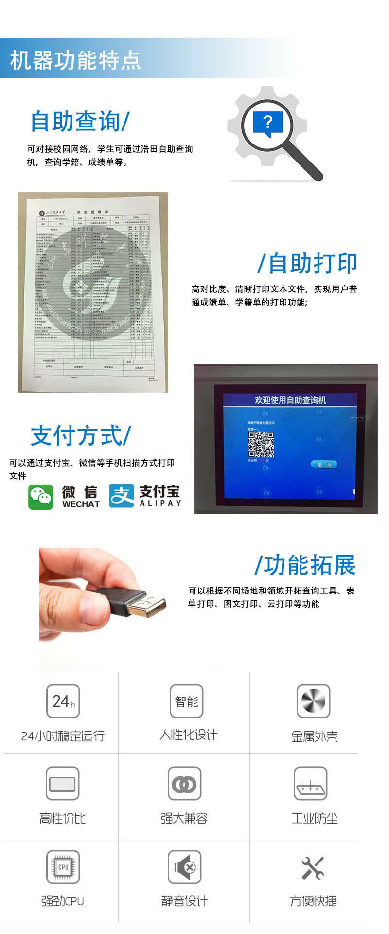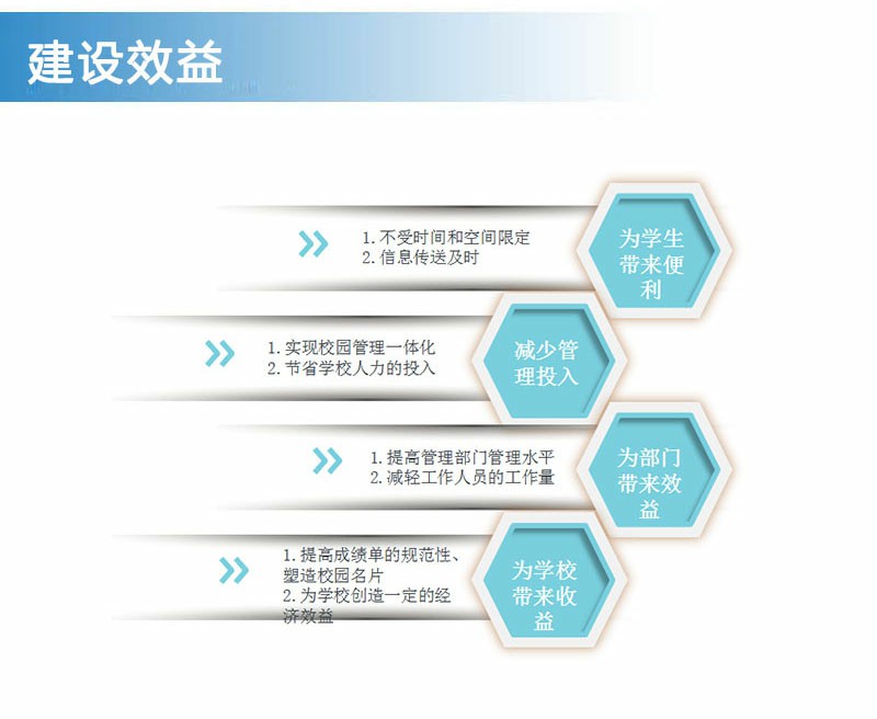 (1)建立一個高效實用的校園學生自助服務體系,在校內設立若干臺校園自助打印系統設備,可以24小時不間斷地為學生提供便捷的成績單、證明文件打印。