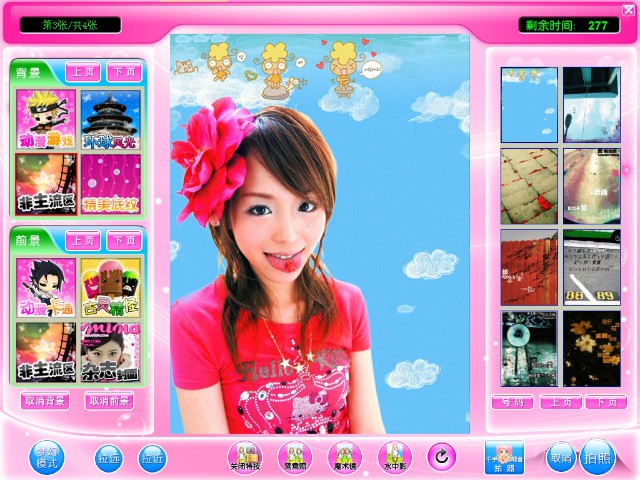 在拍照時,可在主界面左側的背景和前景類別框選擇圖片類別,此時主界面右邊會出現所選類別圖片的縮略圖,選擇喜歡的背景或前景圖片。