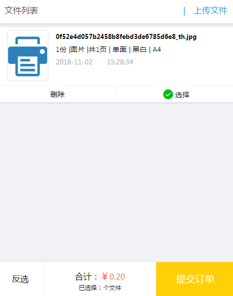 微信界面上顯示要打印的文件列表,打印的參數(shù)等,選擇后,下面又金額顯示,確認無誤后點擊提交訂單。