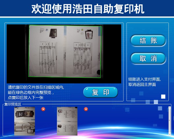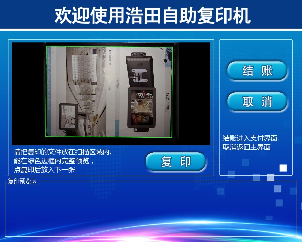 把文檔/圖片放入掃描框內,自動識別掃描進系統,在預覽區顯示,點擊【結賬】后后按照您復印的內容加減份數,最后點【支付】