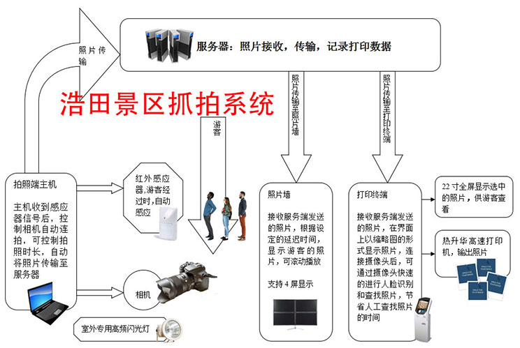 1,自助打印,只要游客經過特定區域,就會觸發拍照系統進行快速抓拍。并上傳到云端,另一端實現自助打印。
