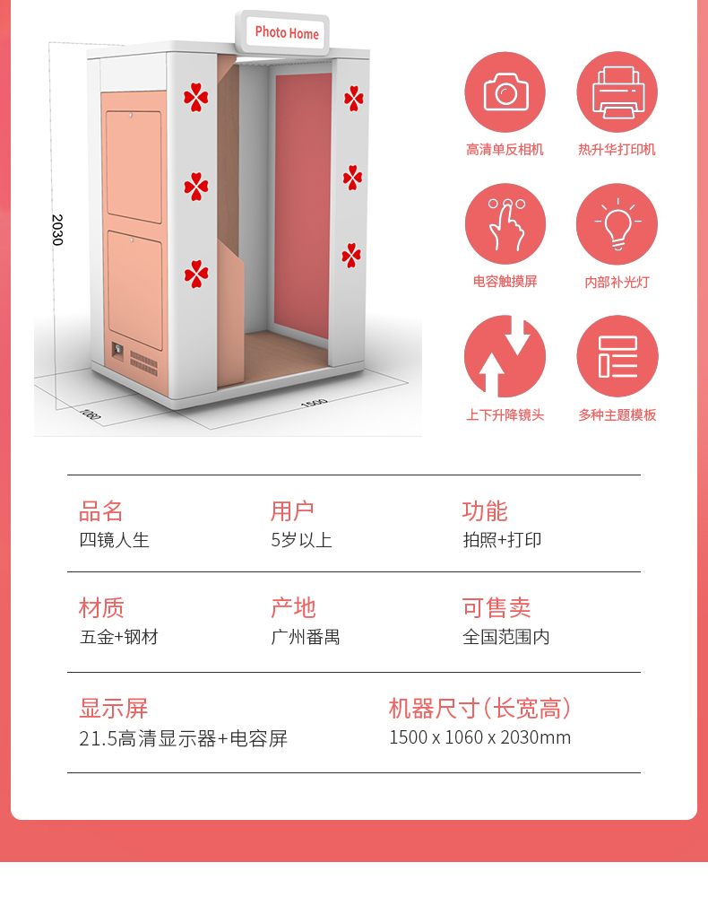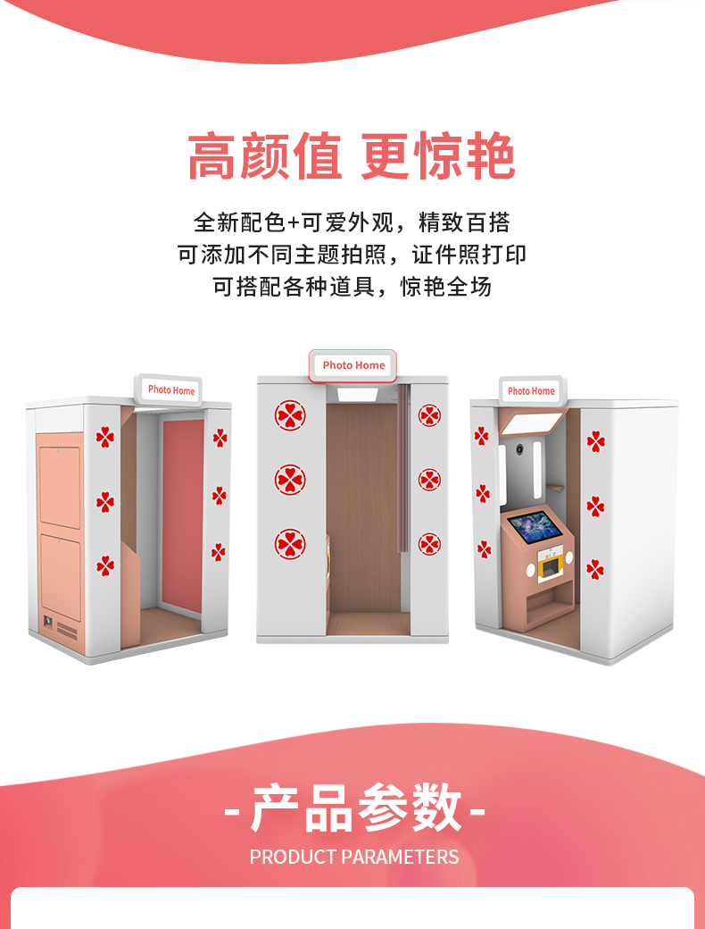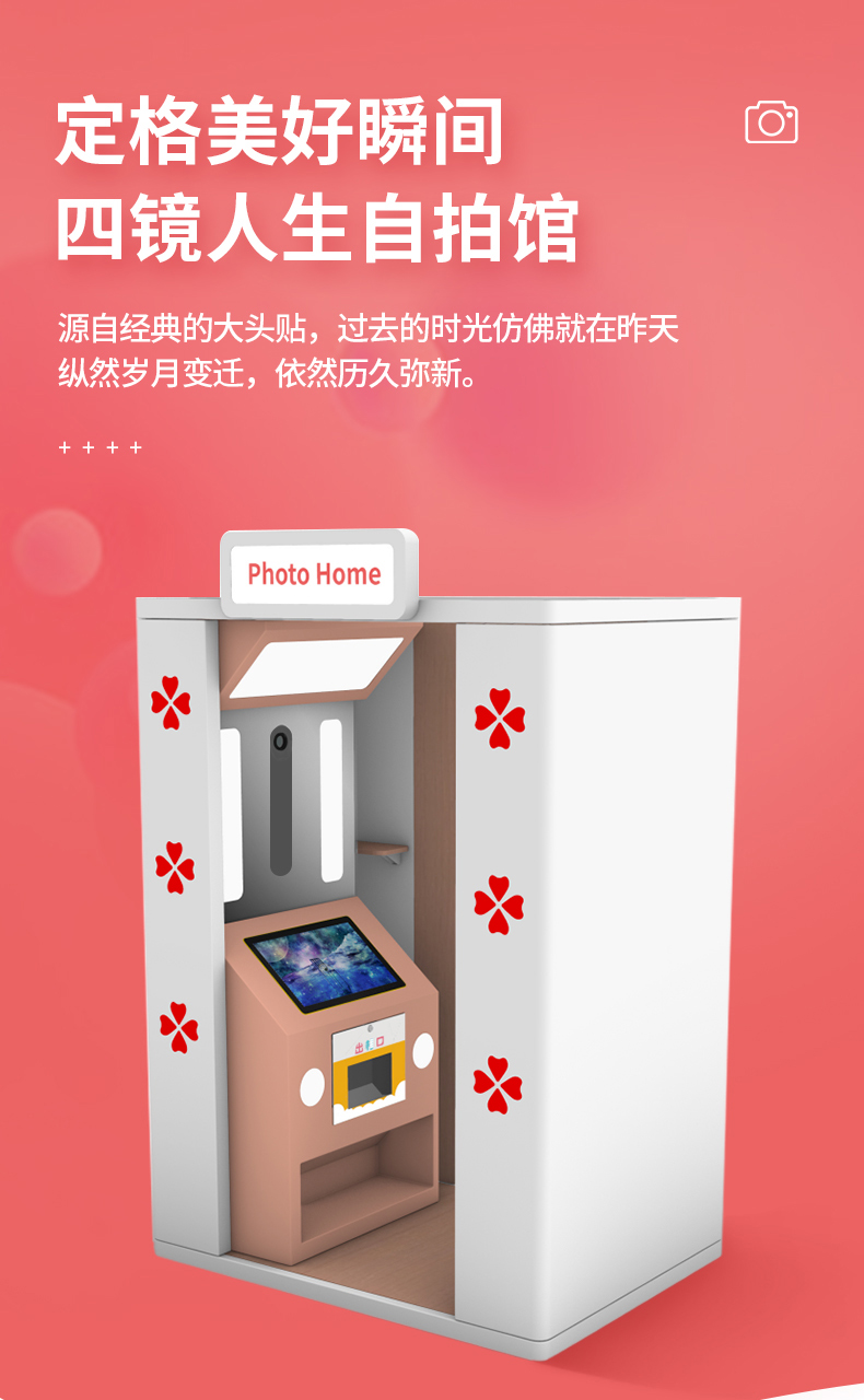 產品特點:這款大頭貼自拍機可電動升降鏡頭,滿足不同身高需求的人可直接按鍵上下移動鏡頭,非常的便捷智能化,并且軟件上更是加了AI寫真的功能,有趣好玩的拍照屋投放地點建議在年輕人密集的商場、電玩城、網紅店鋪等有消費力的場地建議投放一臺至兩臺機器以上。